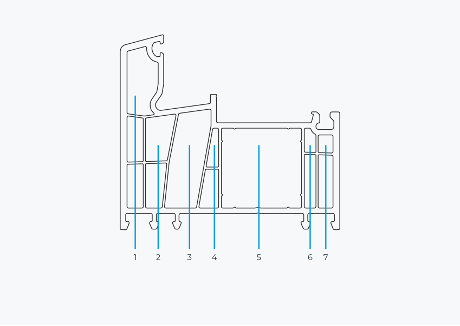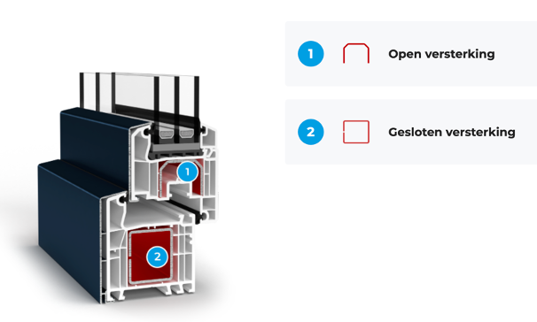 De grote kamer wordt gebruikt om staalversterking in het kozijn te plaatsen. Enkel kunststof is niet sterk genoeg om stabiliteit en sterkte te garanderen voor het kozijn. . Ze worden rond de omtrek van de raamkozijnen en de vleugels geplaatst. Op basis van hun vorm maken wij onderscheid tussen gesloten en open verstevigingen. Bij grotere constructies zal de dikte van het staal dikker zijn. Bij deuren is dit standaard ook dikker.