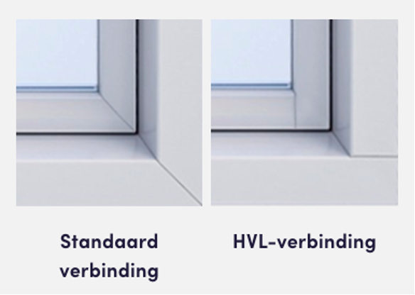 Een ander voordeel van het 120mm profiel is de mogelijkheid om deze met een HVL-verbinding uit te voeren. Bij kunststof kozijnen zijn de hoekverbindingen normaal diagonaal, bij een HVL-verbinding zijn deze recht, net zoals een houten kozijn. In combinatie met een kleurfolie met houtnerf lijkt het kozijn bijna 1-op-1 op een houten kozijn.